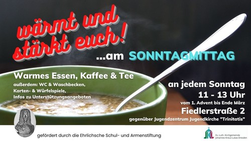 Die Gemeinde lädt von 1. Advent bis Ende März an jedem Sonntag zur Mittagszeit von 11 bis 13 Uhr in den Kirchsaal des Trinitatishauses ein. Hier ist ein Ort, der Leib und Seele stärken soll. Es gibt warme Getränke, eine warme Mahlzeit, Raum für Begegnung, Möglichkeiten zum Gespräch, Gesellschaftsspiele, Sanitärräume...